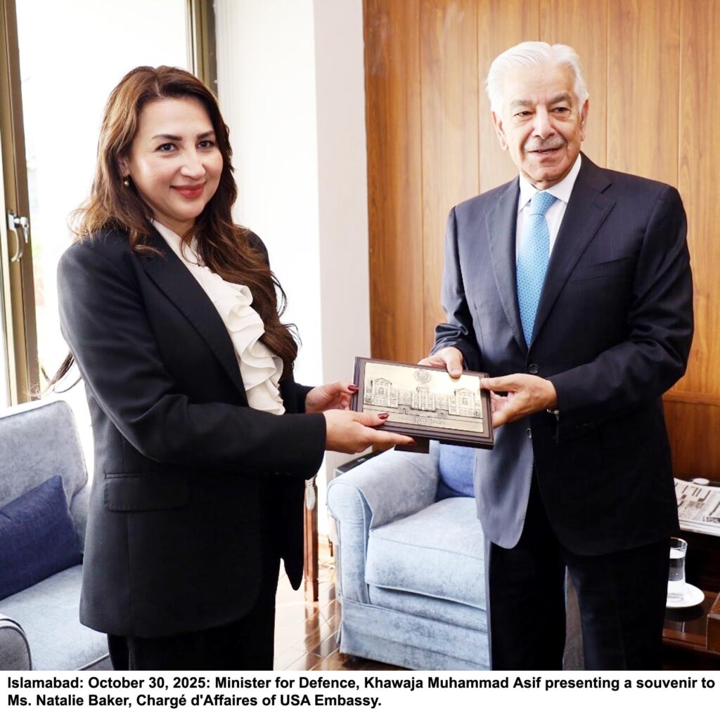 Islamabad: October 30, 2025: Minister for Defence, Khawaja Muhammad Asif presenting a souvenir to Ms. Natalie Baker, Chargé d’Affaires of USA Embassy.